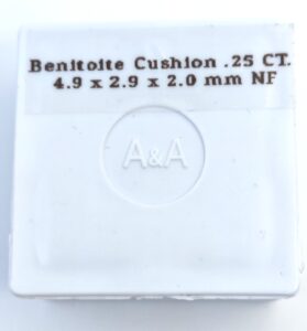 Benitoite Gemstone Cushion Cut .25 CT. This is a Rare Benitoite Cushion Cut .25 carat Gemstone with a beautiful medium blue color. This round brilliant cut gemstone is faceted and sourced from the United States from the Benitoite Gem Mine in San Benito County Ca. With excellent cut grade and (NF) Near Flawless clarity, this natural gemstone is ideal for jewelry or collection. With dimensions of 4.9 x 2.9 x 2.0 mm. This gemstone is a unique and desirable addition for any gemstone collection. Official State Gemstone of California. From the Benitoite Gem mine in San Benito County California USA. Rest assured your satisfaction is guaranteed. Returns are accepted for 14 days. US seller Fast shipping. Ships to you insured with tracking info and signature required for secure delivery.